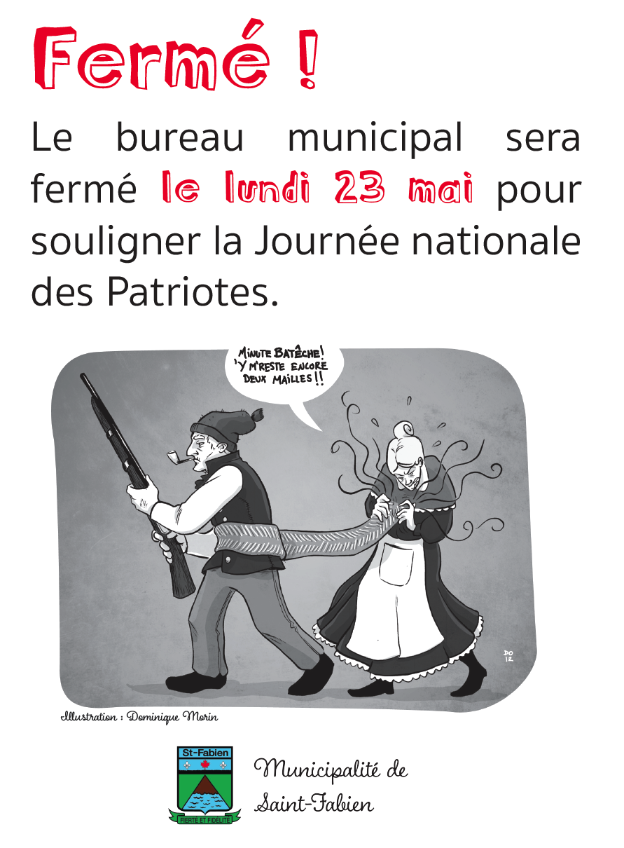 Journée des Patriotes – Fermeture du bureau municipal Mai 23 Toute la journée Autres Journée des Patriotes – Fermeture du bureau municipal